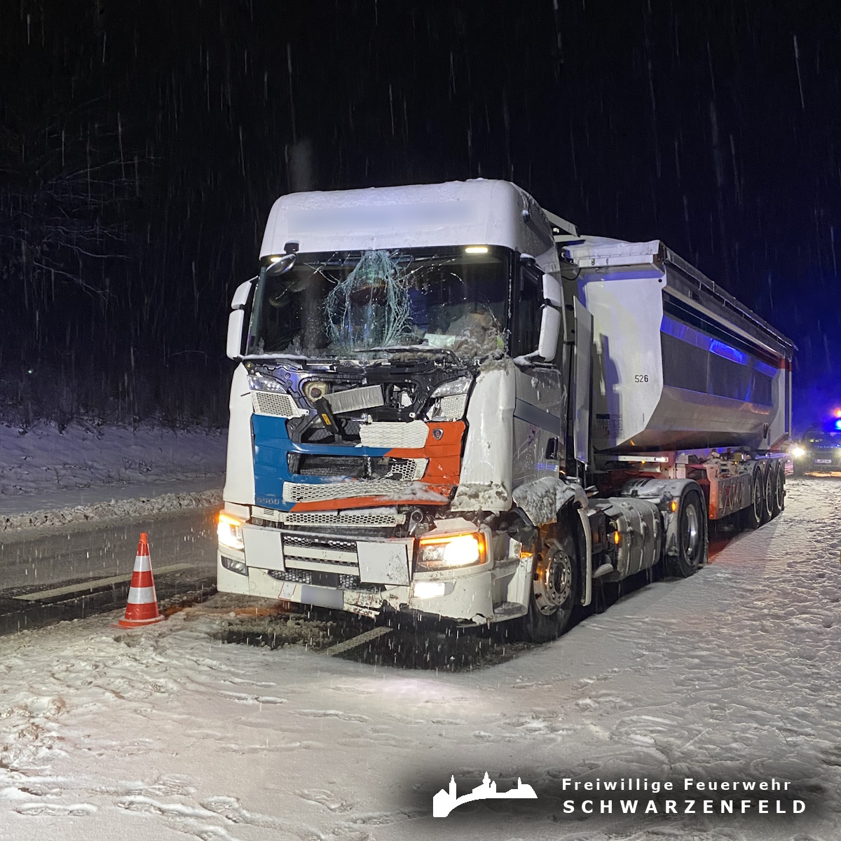 Zeitgleich zum Unfall auf der Autobahn verunfallte in der Böttgerstraße in Schwarzenfeld ein weiterer LKW und blockierte die Fahrbahn. Hier übernahm das am Standort auf Bereitschaft verbliebene LF20. Der LKW konnte innerhalb kürzester Zeit aus dem Graben gezogen und wieder fahrbereit gemacht werden.