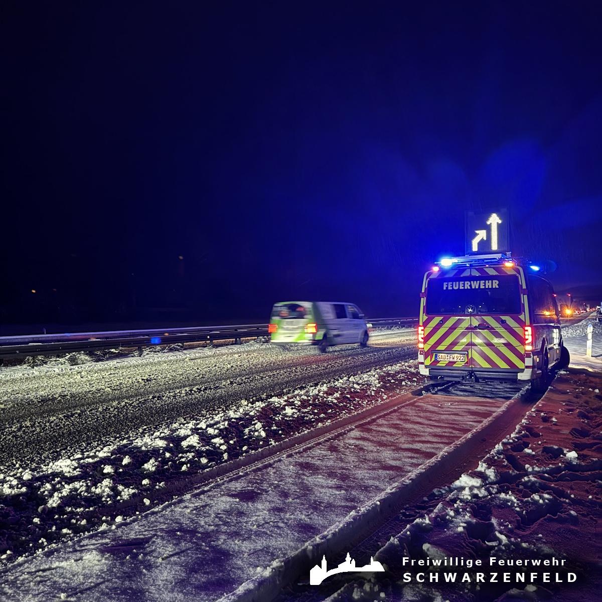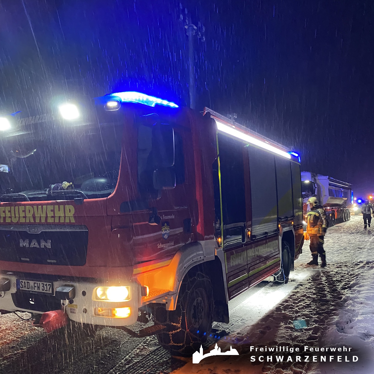 Im starken Schneefall übernahmen wir die Absicherung und lenkten den Verkehr mittels VSA an der Unfallstelle vorbei. Zudem wurde diese ausgeleuchtet.