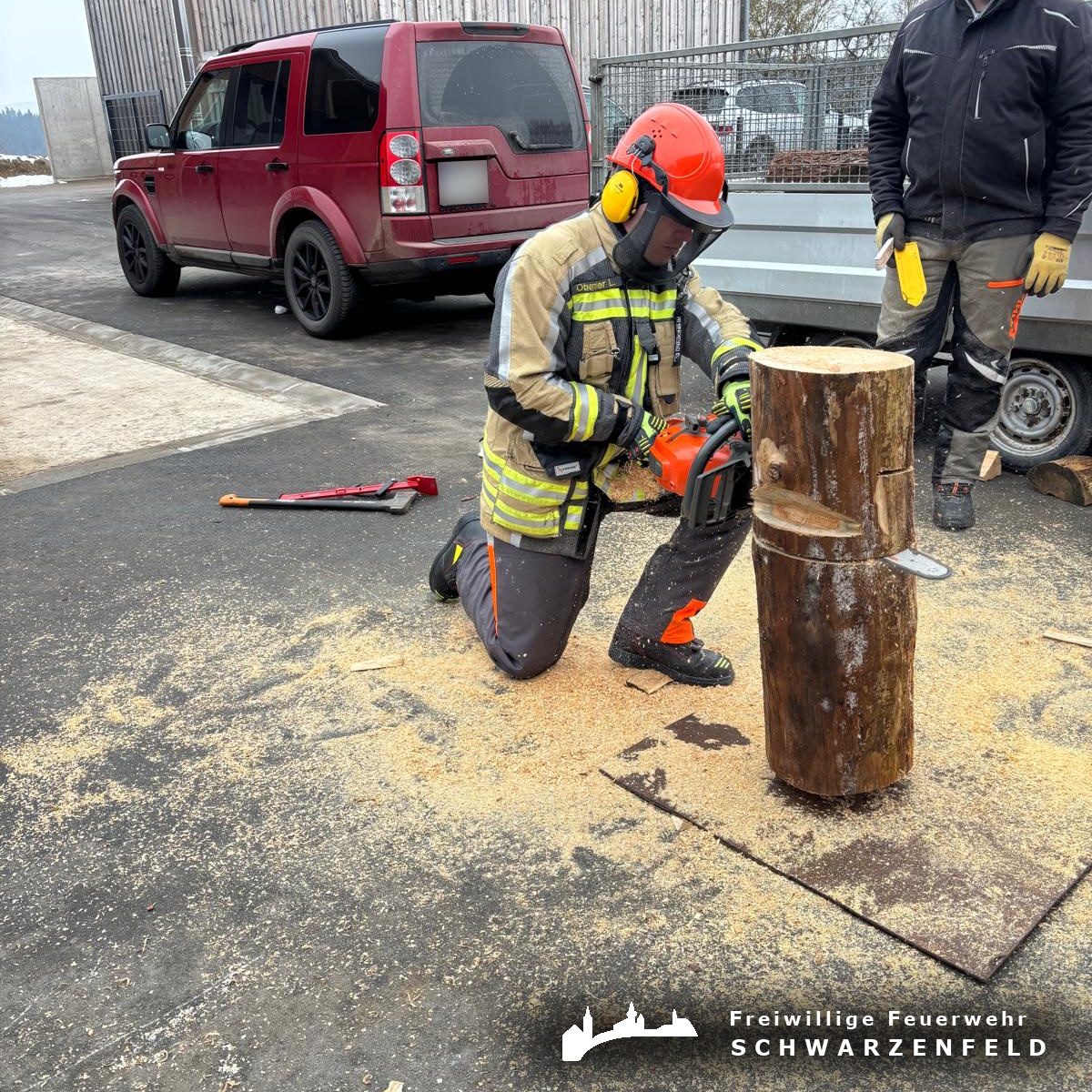 In Theorie und Praxis vermittelten die Ausbilder das notwendige Wissen und die richtigen Handgriffe für den sicheren Umgang mit einer Motorsäge inkl. Zubehör u.a. an einem Spannungssimulator. Für Feuerwehren ist dies wichtig, da man vor allem bei Sonderlagen wie z.B. bei Wind- und Schneebruch zum Einsatz kommt und dann vor Ort das womöglich unter Spannung stehende Holz korrekt beurteilen und bearbeiten können muss.