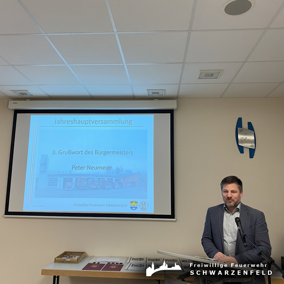 Stv. Landrat Jakob Scharf bedankte sich bei der Wehr und stellte fest, dass das Ehrenamt der Feuerwehren ein Einsatz am Menschen ist. Dabei sei es unwichtig welches Geschlecht, Alter, Religion oder Hautfarbe die Bedürftigen haben. Die Feuerwehr hilft einfach.