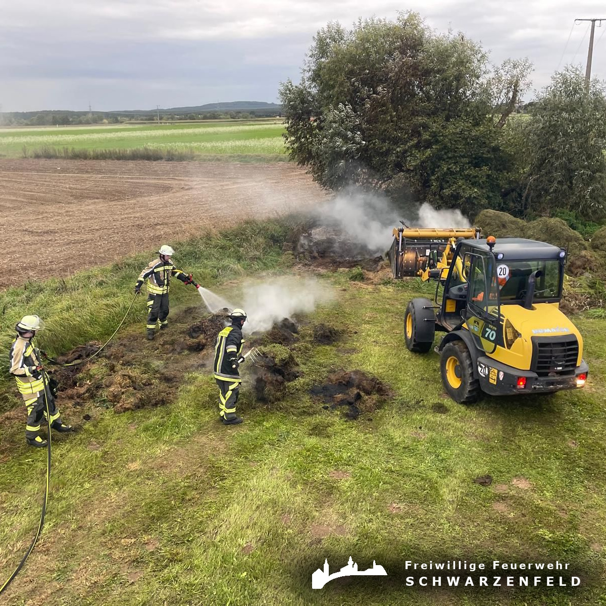 Für das Ablöschen kam der Schnellangriff zum Einsatz. Unterstützung erhielten wir vom nachgeforderten Radlader des gemeindlichen Bauhofes.
