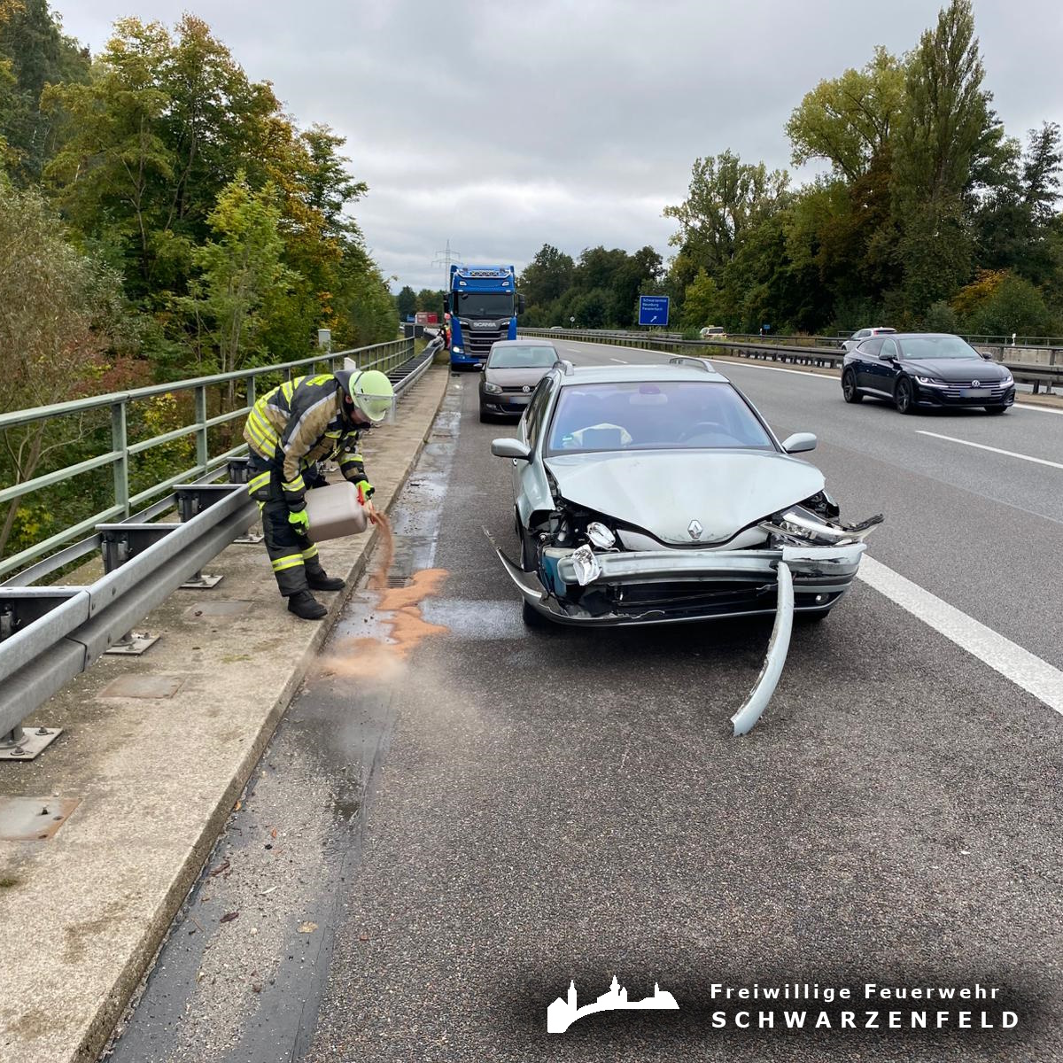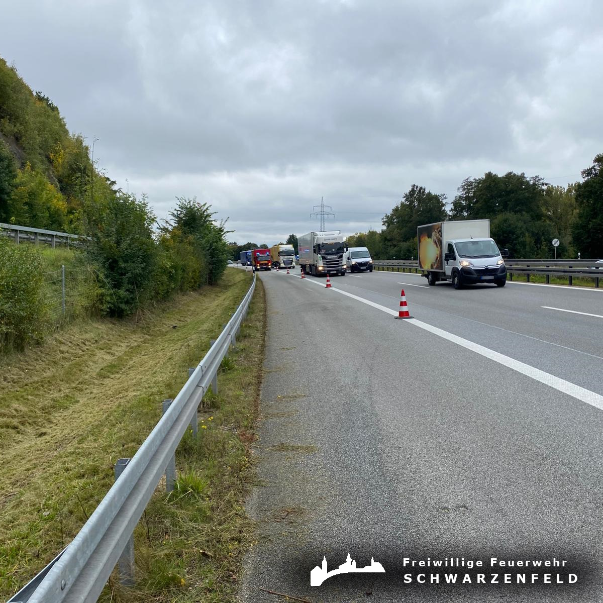 Auf der Autobahn fand man kurz nach der Anschlussstelle Schwarzenfeld einen Auffahrunfall zwischen einem PKW und einem LKW vor. Polizei und Rettungsdienst waren bereits vor Ort. Da sich alle Fahrzeuge auf dem Standstreifen befanden und eine Person bereits durch den Rettungsdienst betreut wurde, beschränkten sich unsere Aufgaben auf die Verkehrslenkung und die Fahrbahnreinigung.